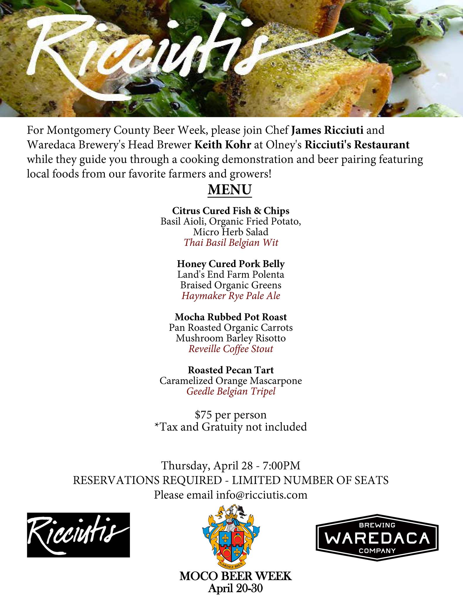 For Montgomery County Beer Week, please join Chef James Ricciuti and Waredaca Brewery’s Head Brewer Keith Kohr at Olney’s Ricciuti’s Restaurant while they guide you through a cooking demonstration and beer pairing featuring local foods from our favorite farmers and growers!